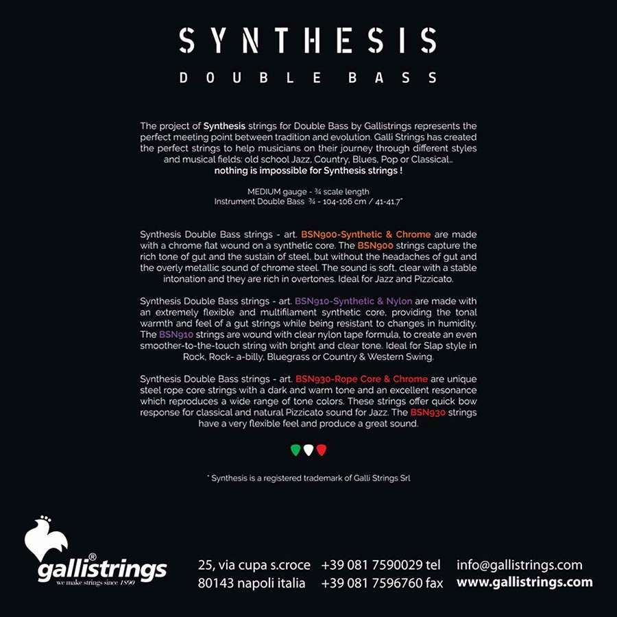 Synthesis Double Bass strings BSN-930-Rope Core & Chrome are unique steel rope core strings with a dark and warm tone and an excellent resonance which reproduces a wide range of tone colors.