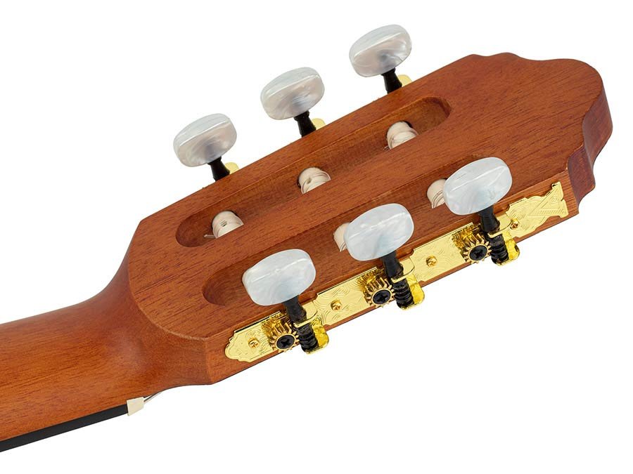 Traditional gold machine heads (with pearloid-button tuners), and a beautiful ABS center back strip round out the traditional look of the Valencia Series 400 range. The transparent, satin finish and tasteful appointments highlight the Series 400 understated good looks.