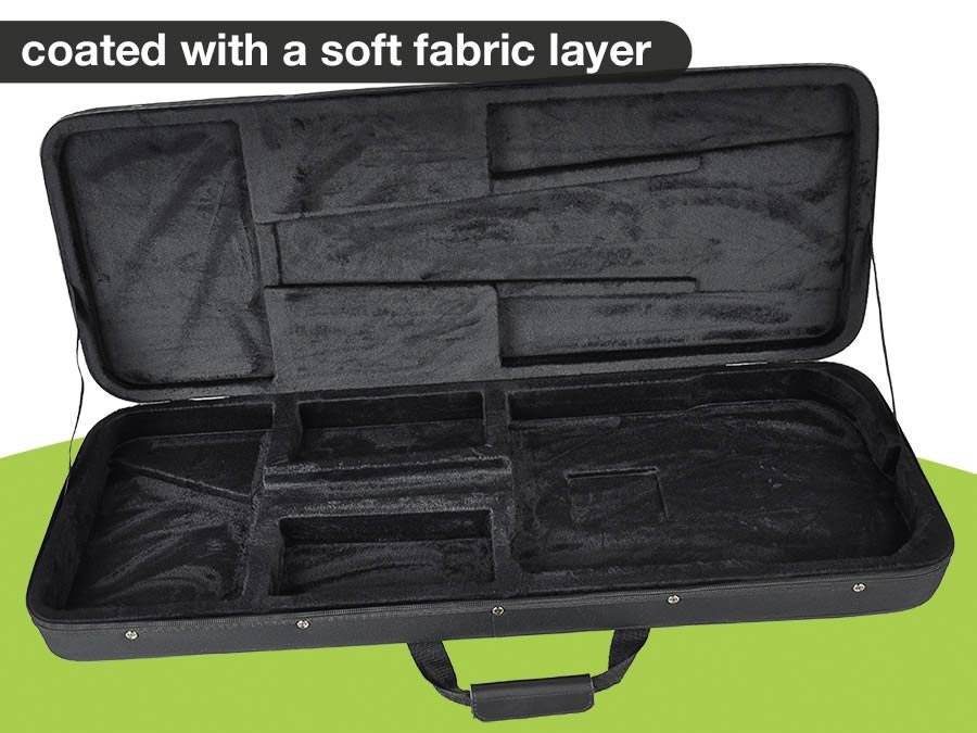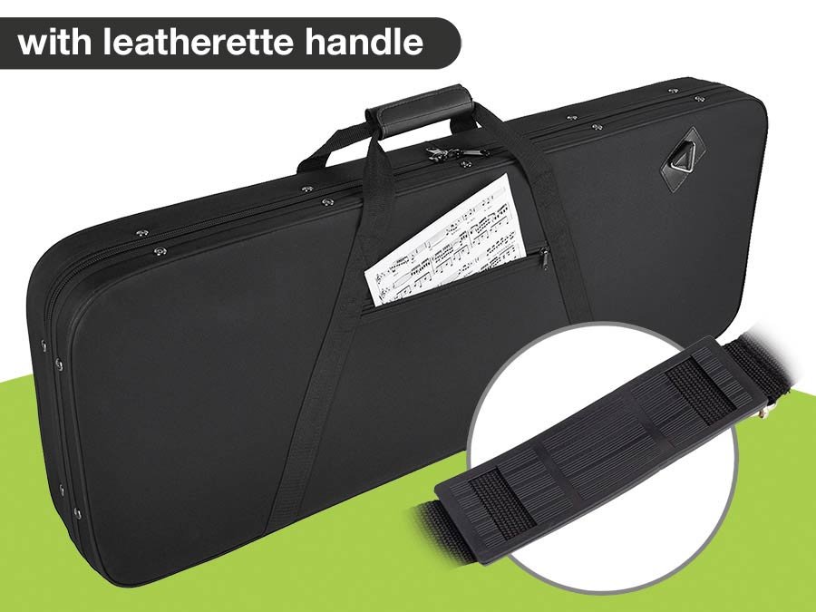cloth covered polystyrene case for electric guitar, with accessory pocket and back strap