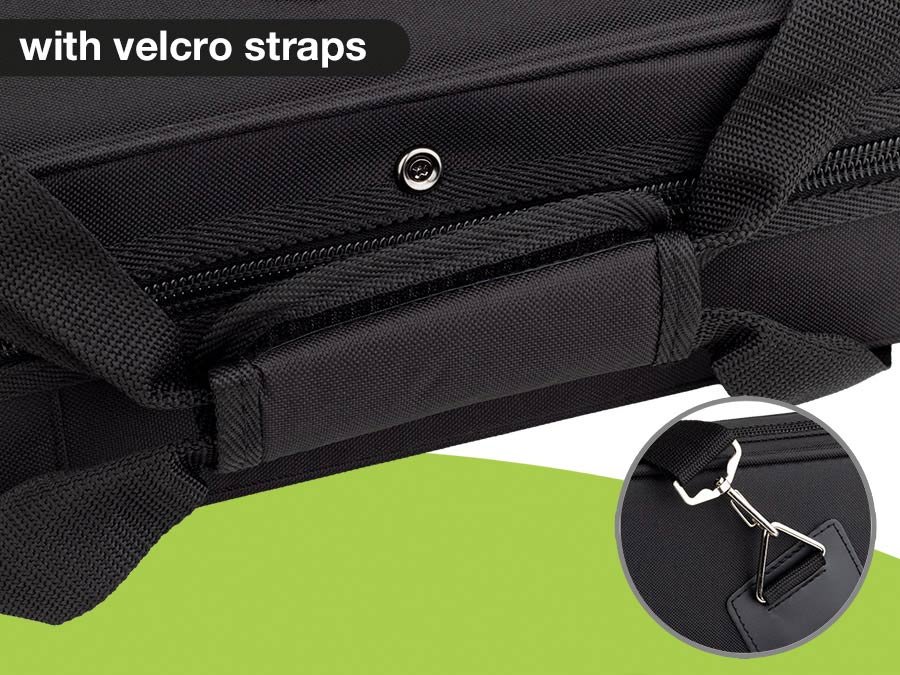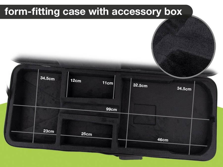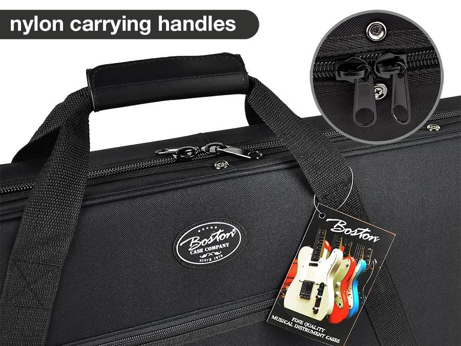 The Boston CEG-250 is a sturdy, lightweight soft case with polystyrene filling coated with a soft fabric layer. The CEG-250 is suitable for electric guitars. It is a form-fitting case in which your guitar can rest comfortably. The neck and bridge are protected and secured by the recesses at the top. At the top you will find an accessory box with space for your music or tablet. You can wear the CEG-250 with either the help from the two included and also removable shoulder strap or simply through the nylon carrying handles which help protect the hands from cuts with the leatherette handle which also combines with velcro straps.