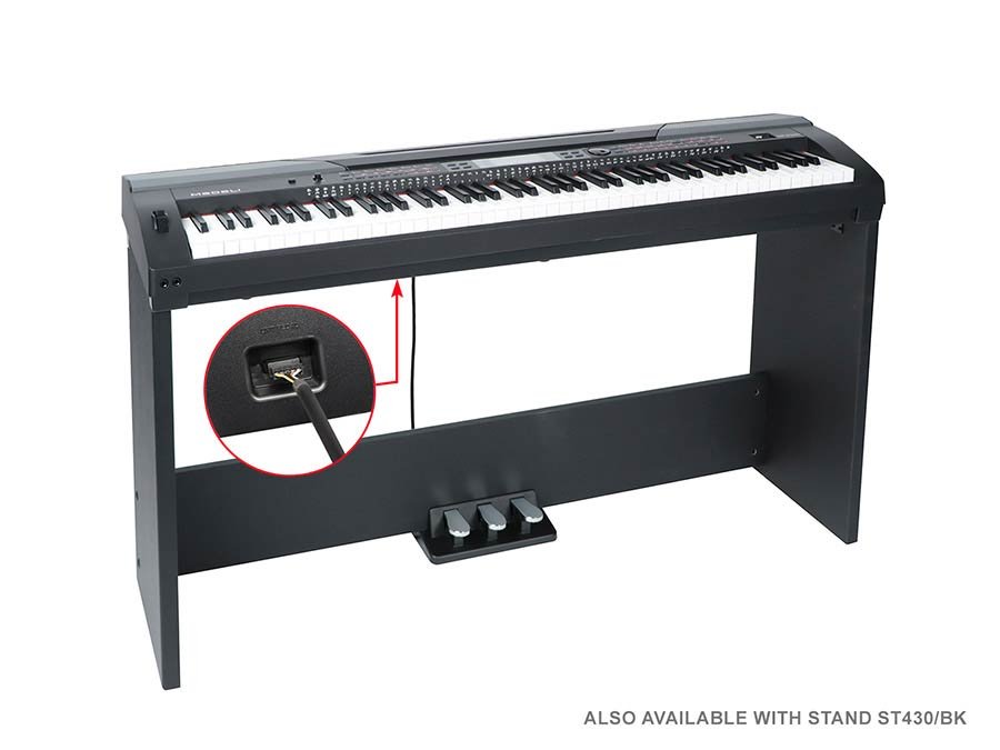 There is a stand available so the piano can serve as a furniture piano on a solid base and with a good appearance in your living room. The unit with the three piano pedals is also included.