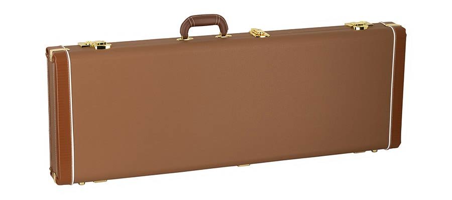 koffer voor elektrische gitaar, bruin tolex, goudkleurige hardware, groen fluwelen interieur