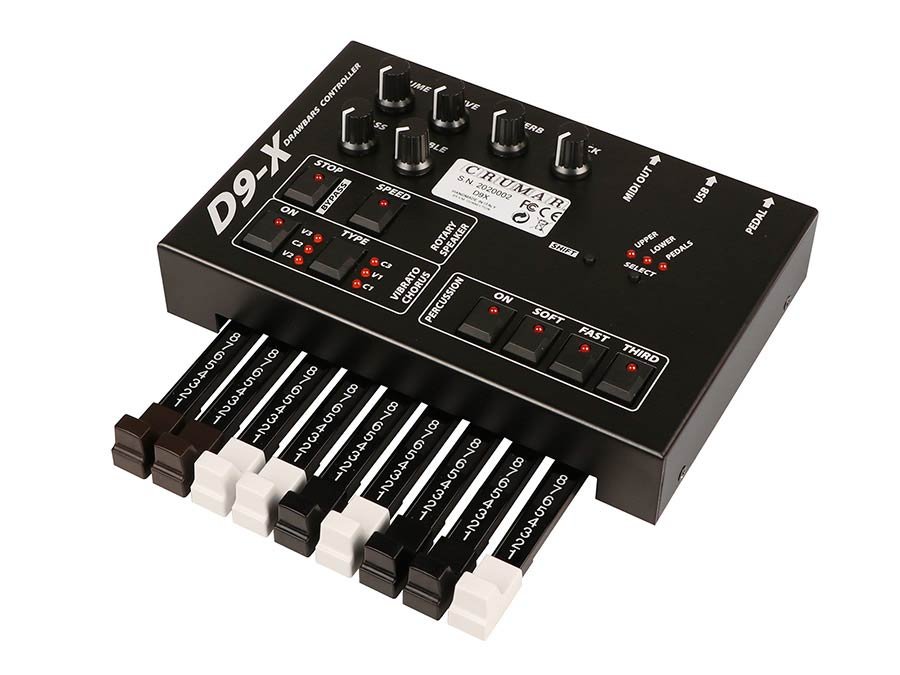 D9X is the "extended" 9-drawbar controller, with all buttons and knobs that you need for full hands-on control of your clonewheel software or hardware module. Compatible with Crumar Mojo / Mojo61, GSi VB3-II and many other products.