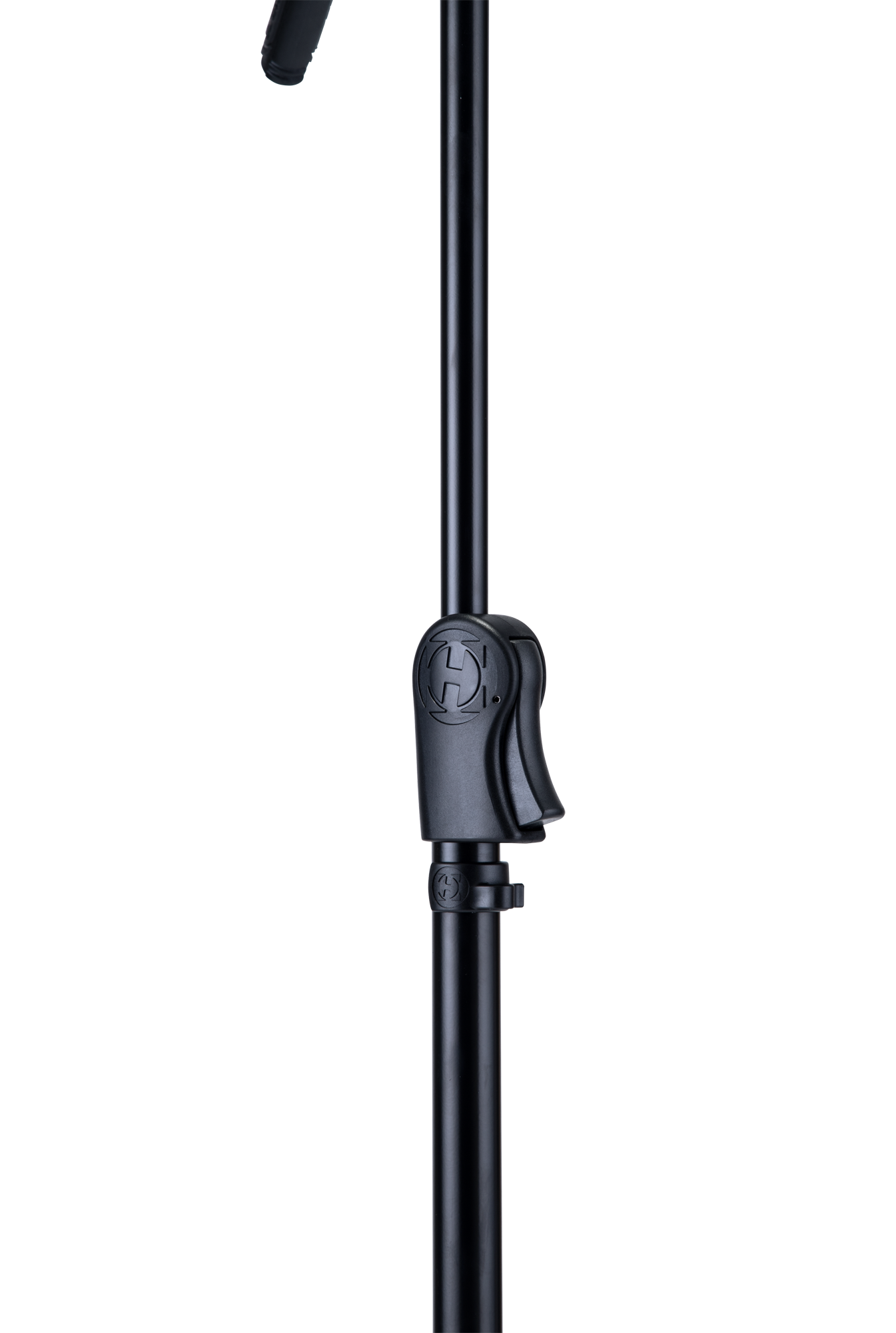 The HERCULES HCMS-533B boom microphone stand with tripod legs has a retractable boom and is equally suitable as a straight stand or boom stand. Additional features include the “Quik-N-EZ Flip Clip” for secure microphone attachment, the 2-in-1 boom clamp, and the “Quik-N-EZ” handle for height adjustment.
