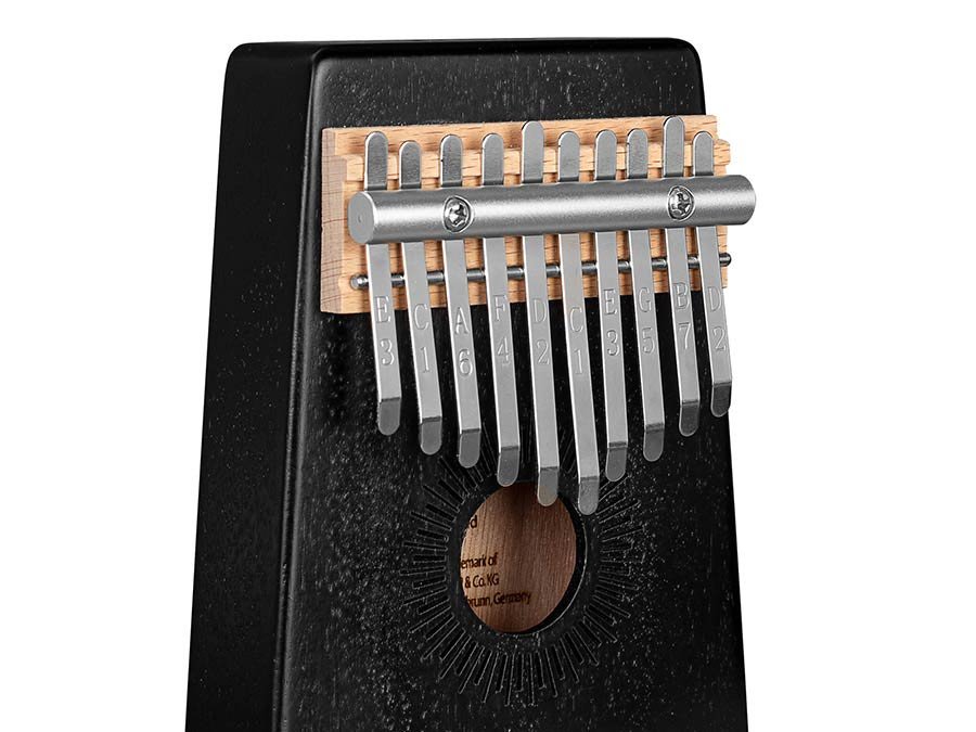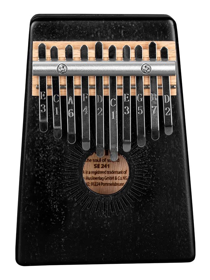 The Sela Kalimba 10 is made of high quality mahogany wood. The body amplifies the low frequencies and thus produces a full, clear and warm sound with a fascinating resonance. The high-quality metal keys are tuned in C major and have a range from c' - e'' (C4 - E5). The stamped notes on the sound keys make the Kalimba suitable for beginners as well as advanced players.