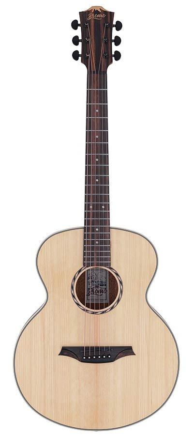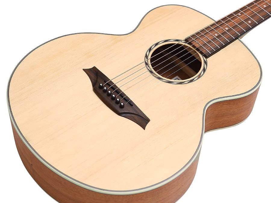mini jumbo acoustic guitar, solid spruce top, amara ebony fb, natural, sponge padded bag