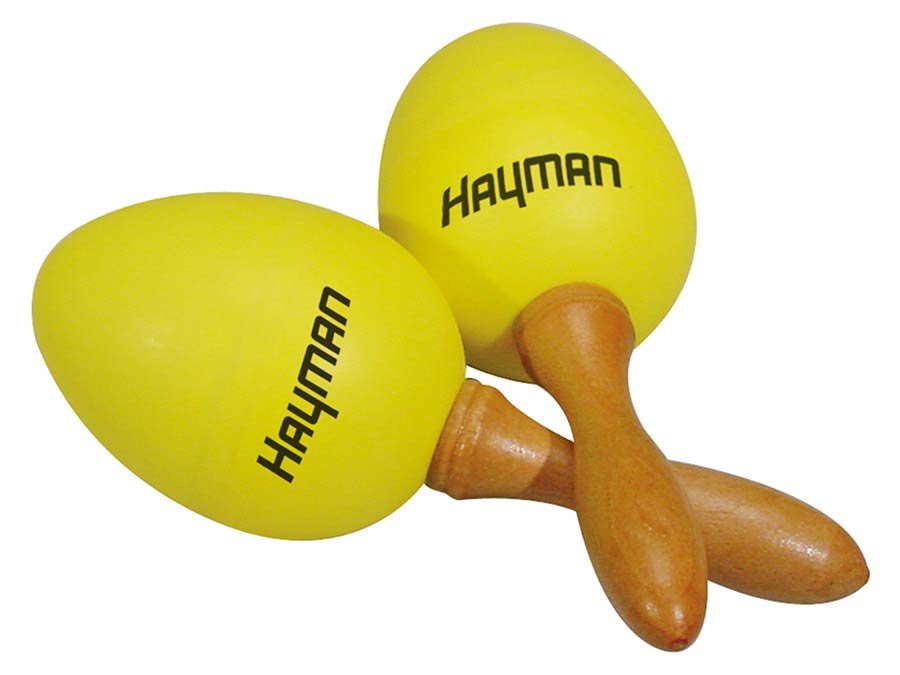 shaker eggs, plastic, pair, with handle, yellow, 45 grams