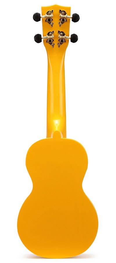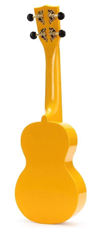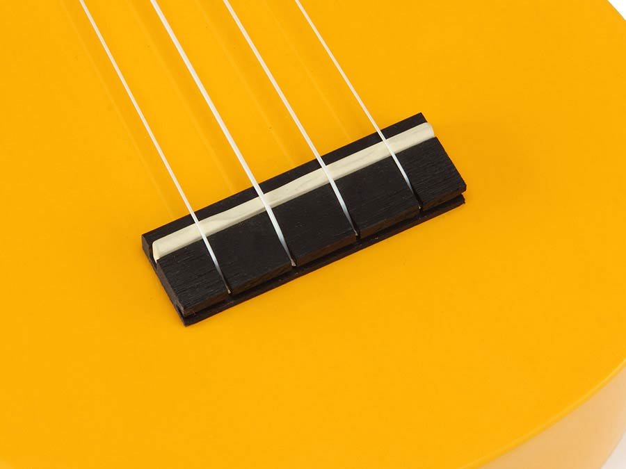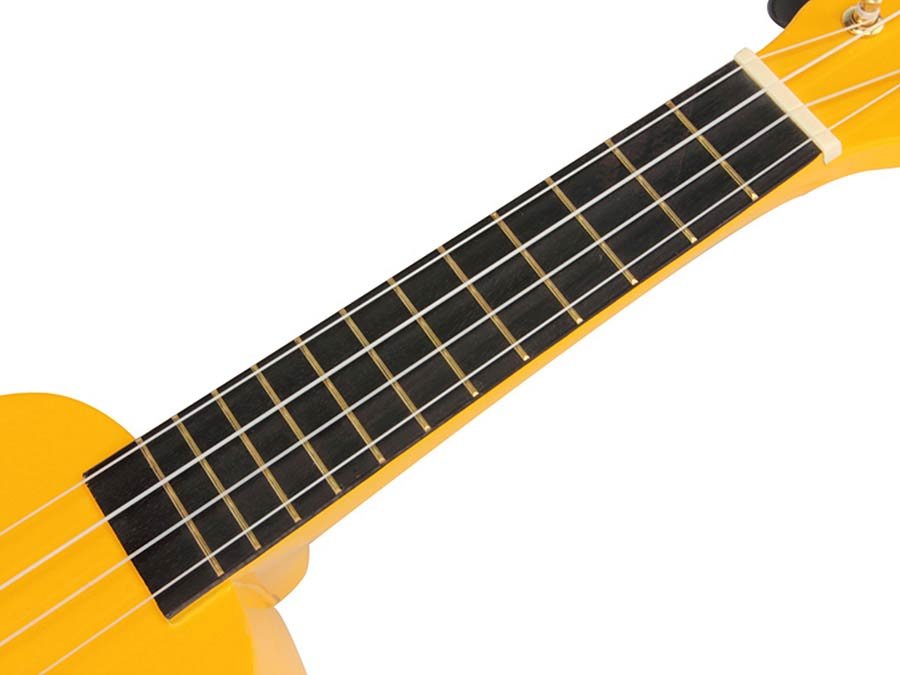 ukelele, met gitaarmechanieken, Aquila snaren, Nubone zadel en hoes, geel