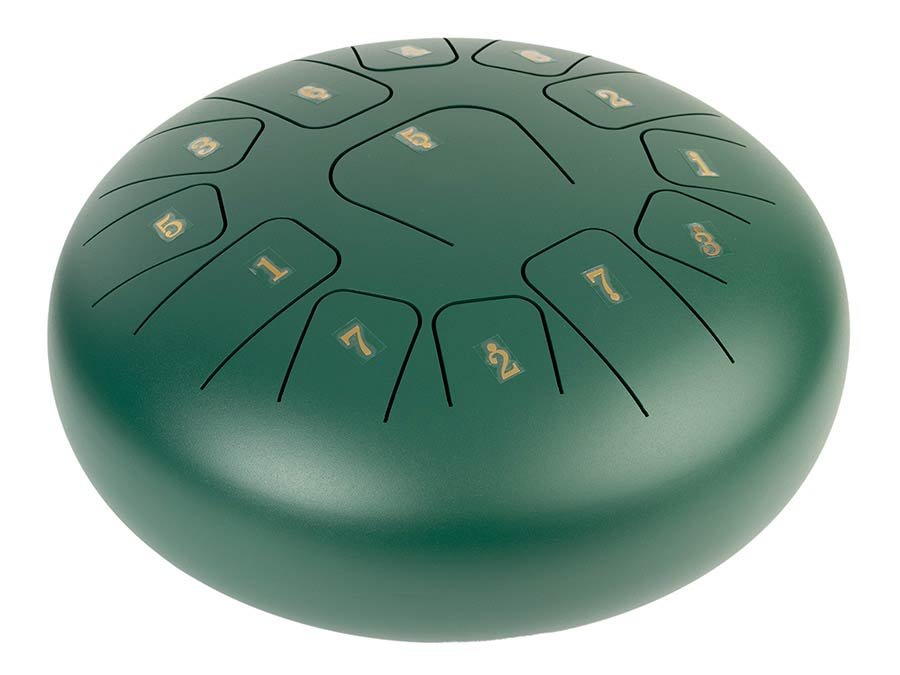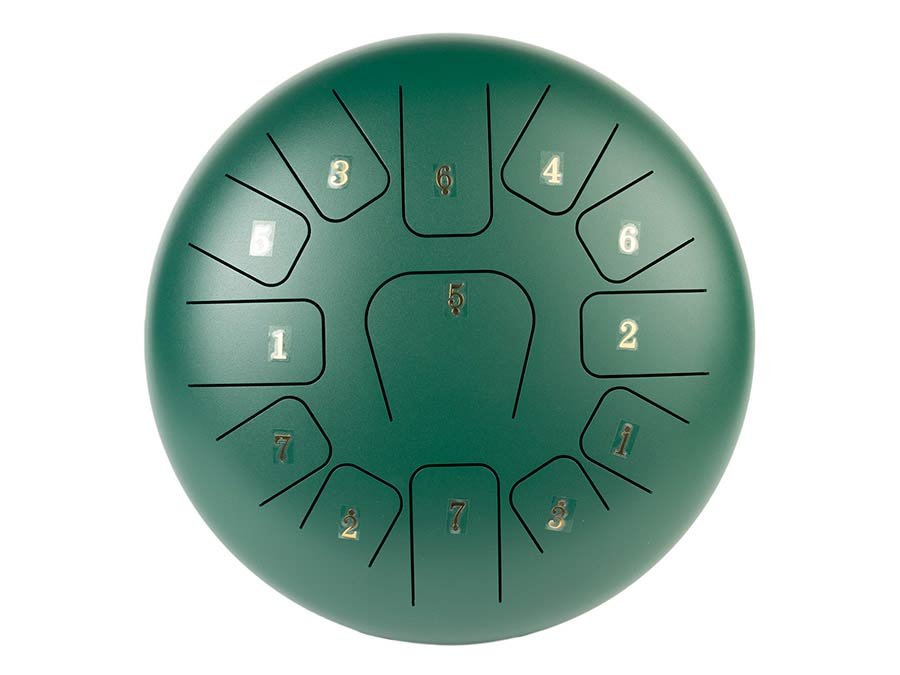 stalen tongdrum 12″ groen, 13 noten C-Major ionian: G3-A3-B3-C4-D4-E4-F4-G4-A4-B4-C3-D3-E3