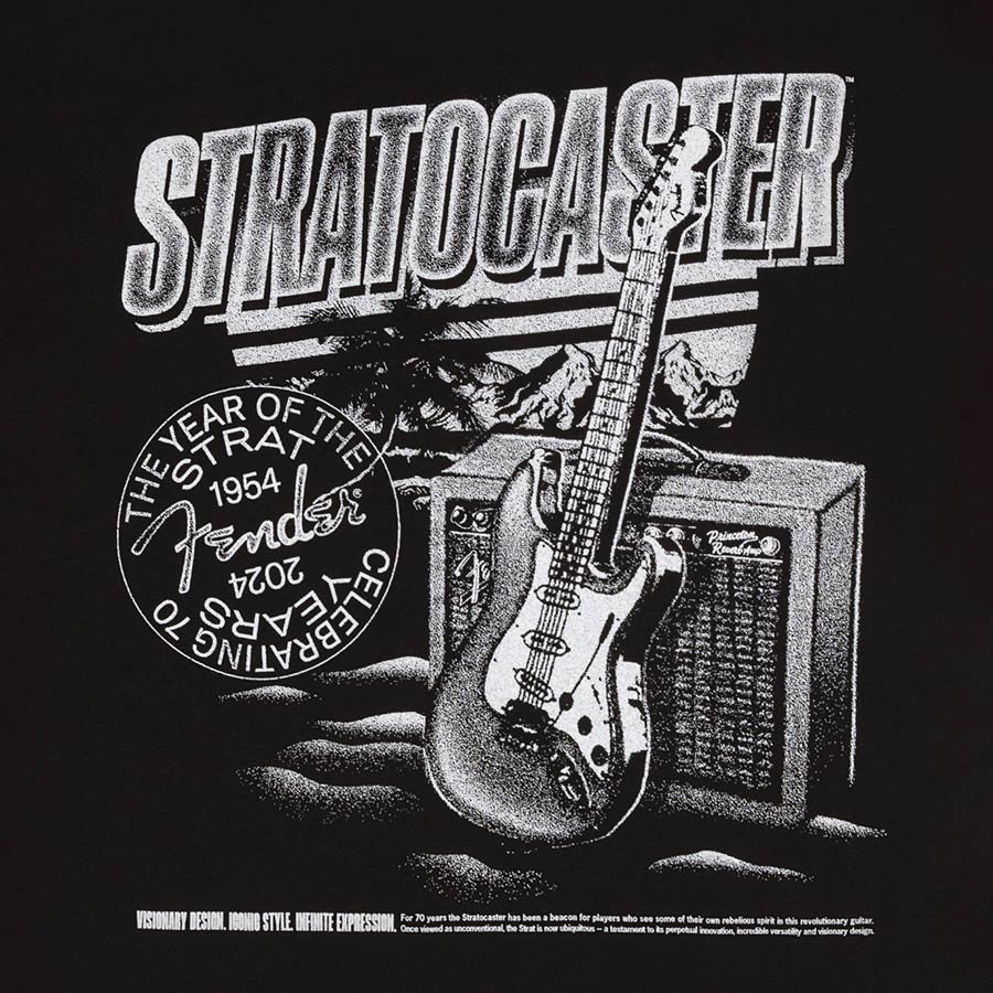 The 70th anniversary of the Fender Stratocaster is quite significant! First introduced in 1954, the Stratocaster has become an iconic symbol in the world of electric guitars, shaping the sound of countless musicians across genres and generations. In celebration of this milestone, Fender is introducing the 70th anniversary Stratocaster T-shirt. Just like your Stratocaster guitar the T-shirt will be a favorite among Fender players and fans worldwide.