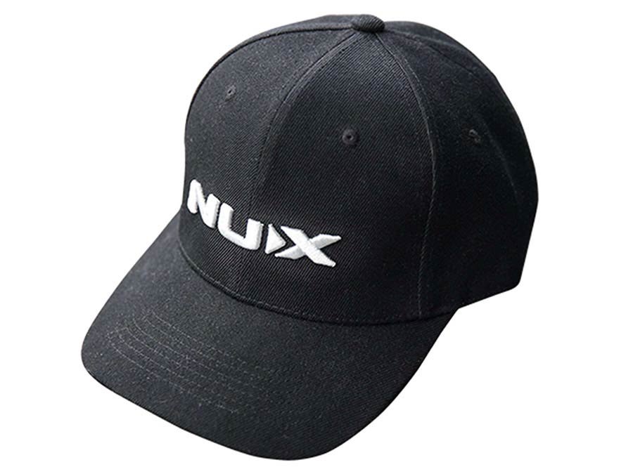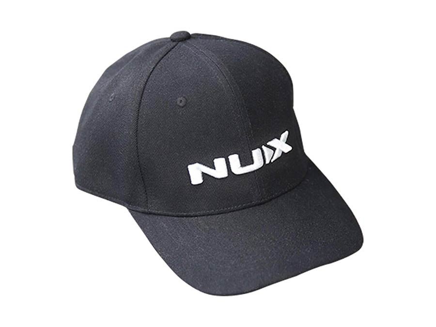 Sleek black NUX baseball cap with embroidered logo on it.