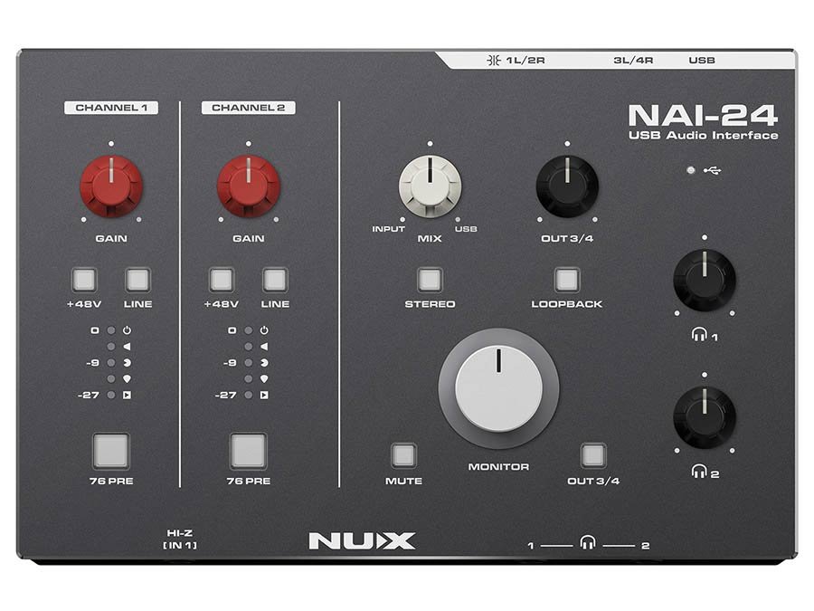 The NUX NAI-24 is a professional 2-in/4-out USB audio interface designed for modern musicians, producers, and streamers. It features a pure Class A discrete preamp with up to 71dB of gain, FET-style analog compression with selectable modes, and 32-bit/192kHz conversion for studio-grade audio. Inspired by legendary hardware, the NAI-24 combines analog warmth with digital control, making it ideal for recording, re-amping, and live streaming. Dual headphone outputs, loopback, and flexible routing complete this compact and powerful interface for creative workflows.
