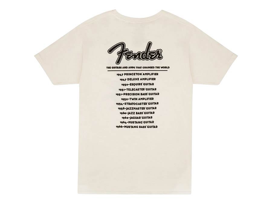 Fender's® world tour is about to begin with this throwback tour t-shirt. In vintage white, with iconic Fender® release dates on the back you will feel part of our rich legacy. Starting in 1947 with the release date of our famous Princeton® classic tweed amplifier and ending the tour in 1966 with the release date of our celebrated 1964 Mustang® bass guitar. What a journey it has been!
